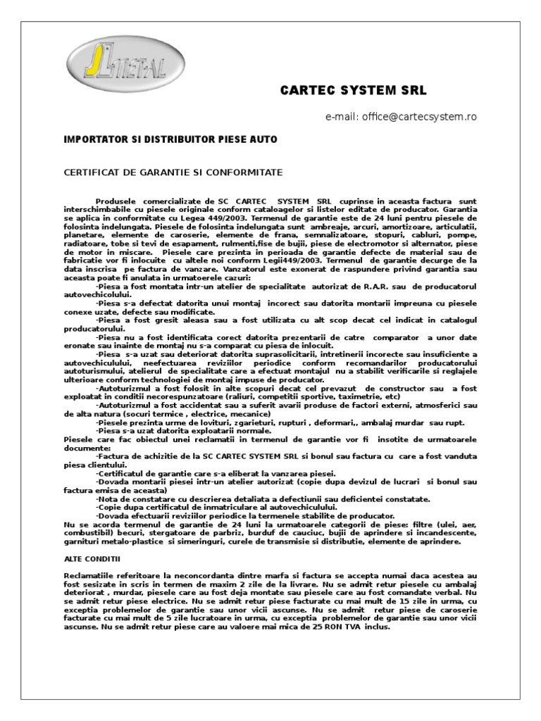 Certificat De Garantie Si Conformitate Model