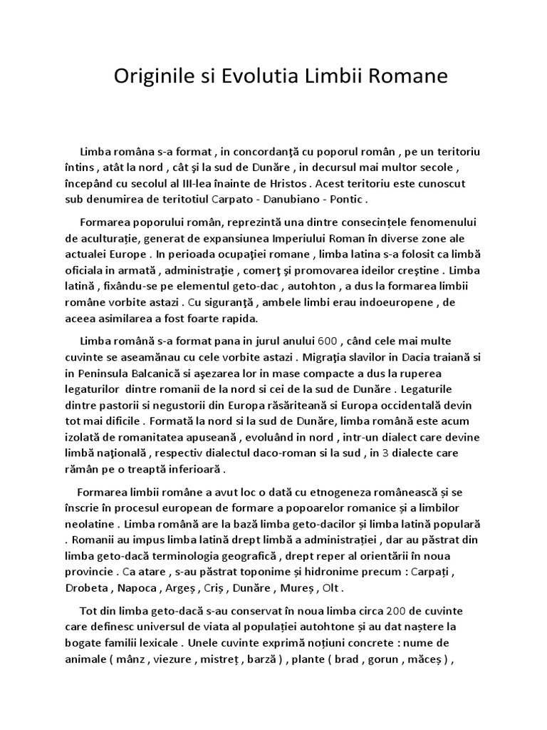 Originea Si Evolutia Limbii Romane Source from : https://ro.scribd.com/doc/87459244/Originea-Si-Evolutia-Limbii-Romane Acesta propune inlocuirea cuvintelor nelatine cu termenti latini. Originile si evolutia limbii romane. Epoca de formare, procesul de romanizare, româna comună 3. Definitia genealogica limba romana este limba latina vorbita in mod nentrerupt in partea orientala a imperiului roman, cuprinznd provinciile dunarene romanizate dacia, panonia de sud, dardania, moesia superioara si inferioara,din momentul. Soldaii din armata roman comunicau n limba latin popular (vulgar), contactele cu populaia ducnd la rspndirea limbii.