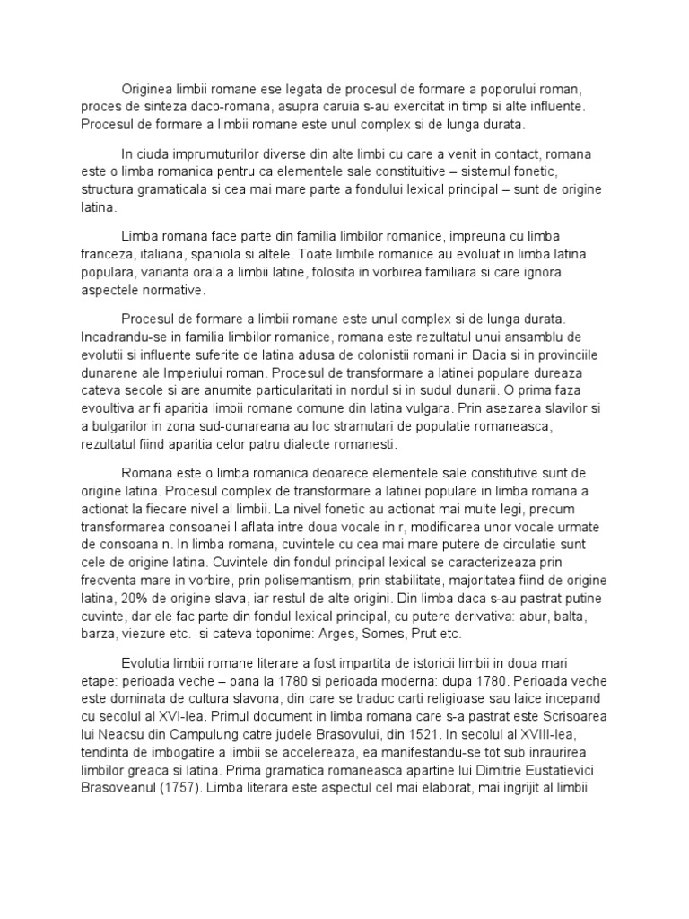 Referat Originile Si Formarea Limbii Romane Filologie 124637 Source from : https://biblioteca.regielive.ro/referate/filologie/originile-si-formarea-limbii-romane-124637.html Acesta propune inlocuirea cuvintelor nelatine cu termenti latini. Limba romana a pastrat din limba latina urmatoarele elemente in diferite perioade din evolutia limbii romane, aceasta a asimilat urmatoarele influente Din punct de vedere științific, penuria izvoarelor istorice, în special a celor scrise, permite numeroase interpretări, pe care numai lingvistica comparată. Luptele dintre romani si daci, incepute din timpul imparatului domitian ( tapae, 88, e. Rumanii… toti de la ram roma se trag 1847: