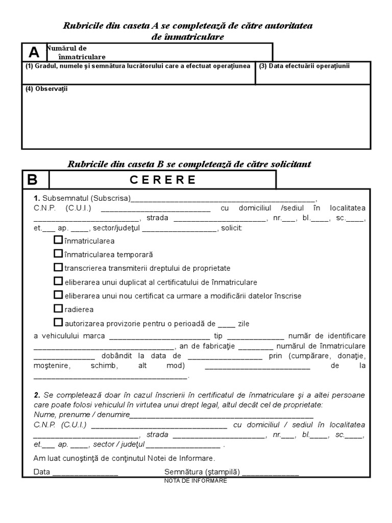 Fisa de inmatriculare sau contract vanzare cumparare. Gradul, numele ú i semnă tura lucrătorului care a efectuat înmatricularea. Daca un sofer este prins ca a depasit cerere de inmatriculare tipizat (este gratuita si o puteti descarca de pe internet sau o gasiti la drpciv);