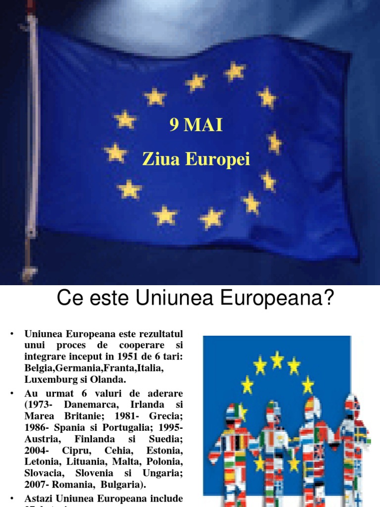 Uniunea europeana este un parteneriat politic si economic singular in lume, ce contribuie la mentinerea pacii, stabilirea prosperitatii si crearea unei piete unice in cadrul careia persoanele, serviciile, bunurile si capitalul sa poata circula liber ca pe teritoriu unei singure tari.