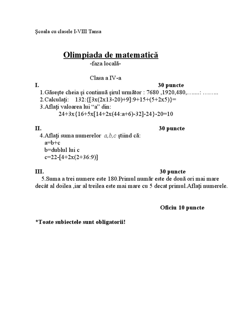 vizitati articolul complet aici : https://www.pdfprof.com/PDF_Image.php?idt=41172&t=25 Inscriere invatamant primar si prescolar. Informații cu privire la organizarea etapei locale a olimpiadei naționale de matematică 2019 vezi aici. Elevii care au obținut cel puțin 11,2 puncte sunt calificați la etapa județeană, din 16.03.2019, ce va avea loc la școala gimnazială mihai drăgan bacău.